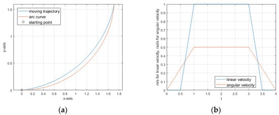 Figure 3 shows an example of the trapezoidal velocity profile with (21) to replace an arc curve. Both linear and angular velocities are designed by TVP as (22) and shown in Figure 3b. The initial location of the robot is [x, y, θ] = [0, 0, 0]. In Figure 3a, an arc curve with same starting and ending point is added in to compare with the moving trajectory. The state of ending point in this example is [1.7100, 1.5934, 1.4997].