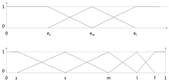 The membership functions of e and u0. [es, em, el] is the three-level scale of e, and the [z, s, m, l, f] is the five-level scale of u0.