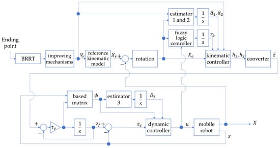 The structure diagram of proposed controller is shown on Figure 6. The reference velocity Vr of the virtual wheeled mobile robot and the path Xr based on the kinematic model are obtained from path planning algorithm. The tracking error Xe, obtained from (15) with a rotation is further provided to estimator 1 and 2 in (29) to obtain â1 and â2, provided to the fuzzy logic controller in (39) to obtain the gain ratio rk, and provided to the kinematic controller in (25) with â1, â2, rk, and a converter to obtain the virtual control law . The dynamic surface control proposes zf from with the first-order differential equation in (31). The based matrix Φ in (34) is provided to estimator 3 to obtain â3 in (36). Finally, the dynamic controller for the mobile robot is designed in (35) with â3, Φ, and ze. The gain of the kinematic controller is also adjusted by u according to (37) and (39).