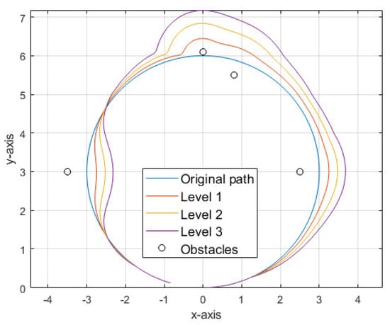 In this section, we focus on the ability of obstacle avoidance. The pseudo-code of obstacle avoidance is shown in Algorithm 4, where n is the number of levels. Figure 7 shows an example with four obstacles close to the original path with three obstacle avoidance levels. In this case, the obstacles are too close to the path and may cause collisions. Here, we define two parameters d0 and d1. d0 is the hard-safe range so that the distance d between the obstacles and the robot should be larger than d0. d1 is the soft-safe range, which is also the threshold for obstacle avoidance design to take effect.