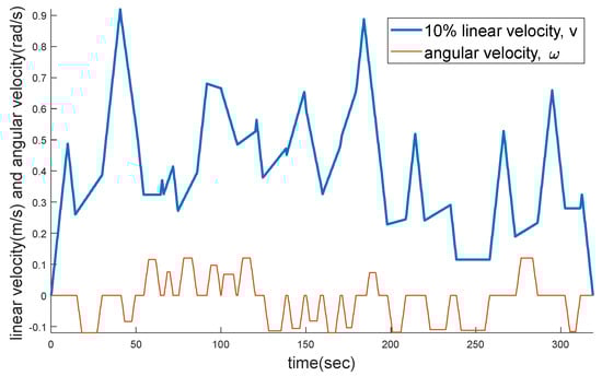 The size of the map is 512 × 512 pixels and the origin is defined in the upper left corner of the map. Figure 8 shows the results of path planning. In Figure 8a, the start point is marked as a circle and located at (15, −30). The goal point is marked as a diamond and located at (270, −212). The blue polyline is the planned path by BRRT, and the red line is the tree of BRRT. Clearly, lots of unnecessary turns are included in the path. Therefore, a smoothed path is given in Figure 8b, including the original path by BRRT, path pruning, and path smoothing. The minimum and maximum extension distance of BRRT is set between 3 to 10. The linear and angular velocities of the smoothed path are shown in Figure 9. The parameters of path smoothing are given in Table 2.