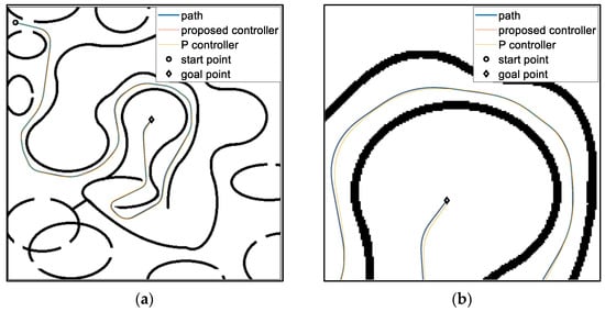 The tracking results of P controller and proposed controller: (a) global view and (b) enlarged view to the goal point.