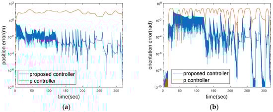 The tracking errors of P controller and proposed controller: (a) position error and (b) orientation error.