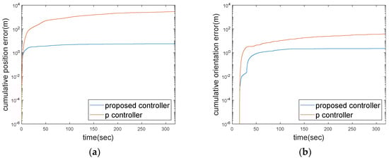 The cumulative errors of P controller and proposed controller: (a) cumulative position error and (b) cumulative orientation error.