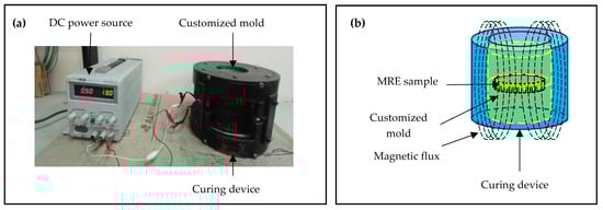 Optical images of anisotropic silicone-based MRE curing process: (a) real magnetic setup and (b) illustration of the magnetic flux inside the curing device.