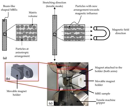 A maximum length of the sample, 25 mm, with a gauge length of 10 mm was prepared for the testing. A movable magnet holder made from non-magnetic material, namely polylactic acid (PLA), was fabricated by using 3D printing, which was used to hold the magnet with an inter-magnet distance of 30 mm during the experimental procedure. Meanwhile, the magnet holder was used to ensure the amount of the induced magnetic field remained consistent throughout the experiment. The tensile machine gripper’s upper parts were attached to the movable magnet holder. When the samples elongate, the magnet holder moves with them to keep the magnet position in the center of the gauge length area. The MRE samples were tested for uniaxial tension using an ASTM D412 procedure at a speed of 50 mm/min for both off- and on-state conditions at room temperature until the sample broke.