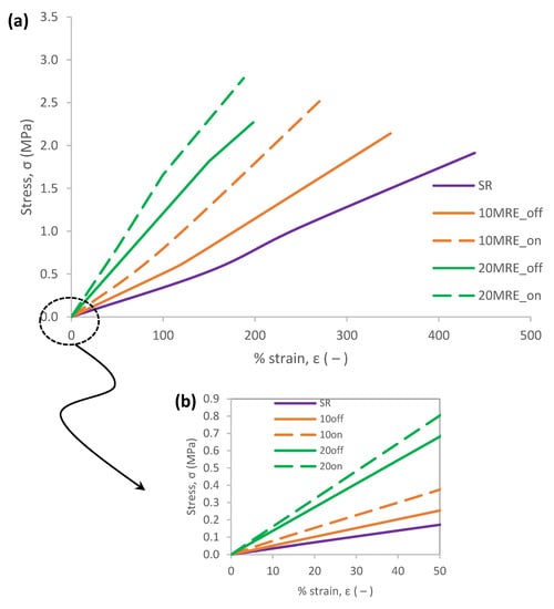 (a) Total strain and (b) magnification at 50% strain on stress–strain results of a quasi-static uniaxial tensile test of pure SR, MREs at 10 vol.%, CIPs and MREs at 20 vol.%, and CIPs with and without magnetic fields.