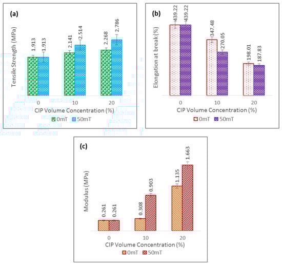 Graphs of (a) tensile strength, (b) elongation at break, and (c) engineering modulus of pure SR and anisotropic silicone-based MREs with 10 and 20 vol.% CIPs during off-state (0 mT) and on-state (50 mT) conditions.