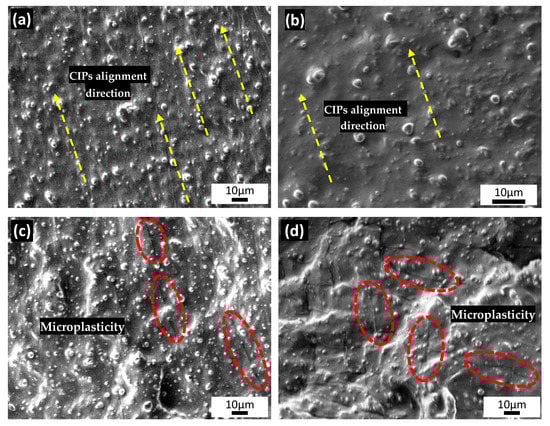 FESEM images for anisotropic MRE with particle alignment of (a) 20 vol.%, and (b) 10 vol.%, and microplasticity formation on (c) 20 vol.% and (d) 10 vol.% CIPs.