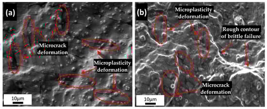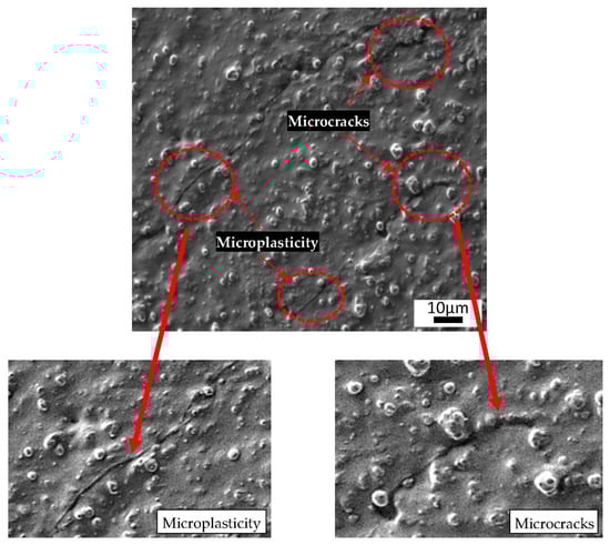 Further investigation was carried out at the MRE condition just before the breakage and when subjected to the greatest strain, as shown in Figure 6. This state represented the Mullins effect on the sample, and this would be the only image associated with this phenomenon that has ever been reported. On Mullins’ finding, microcracks and microplasticity were clearly visible in the image, and the process for their formation agreed with the literature’s hypothesis [].