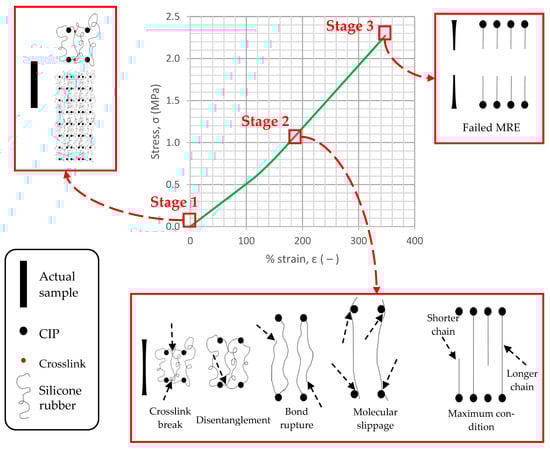 As previously stated, the softening effect, also known as the Mullins phenomenon, may have an impact on MRE samples, particularly the molecular structure. As a result of understanding the microstructure characteristics obtained from the morphological analysis, a proper mechanism could be proposed to further understand the phenomenon, thereby improving the effect to the test method as early as the fabrication stage. Figure 8 depicts the material softening caused by the Mullins effect, indicating that the comparability evaluation of MREs under tension load corresponds to the mechanisms underlying it during the early stage (Stage 1), maximum interval (Stage 2), and failure condition (Stage 3).