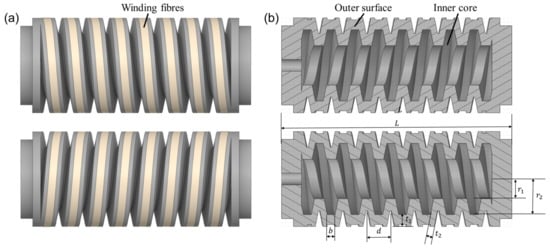 Pneumatic soft helical actuators: (a) two opposite helical structures; (b) longitudinal sections and the geometric parameters.
