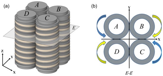 Section 2.1 explained the elongation and twisting characteristics of a single pneumatic helical soft actuator. By bonding two soft actuators of opposite helical directions that are under pressurization (i.e., A&B of Figure 2a), the twisting effects of the two actuators are offset. When adding another two such actuators (i.e., C&D of Figure 2a), the longitudinal extension of the pressured actuators (A&B) can be restrained. In that case, the whole structure will produce a forward bending motion. Figure 2b illustrates a cross-sectional view and the helical directions of the soft wrist. With this structure, twisting of the whole structure can also be achieved by pressurization of diagonal actuators (i.e., A&C or B&D). When all of the four helical chambers are pressurized, the twisting torques of the four actuators are offset due to antagonistic actions, and the stiffness of the wrist can be improved [].
