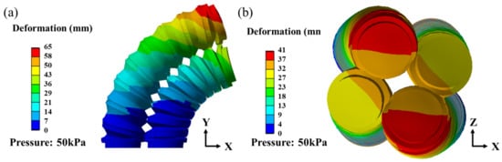 For simulating the behaviors of a soft wrist under pressurization, a reference case was selected based on the sizes of a human wrist. It was assumed that a human wrist has a circular cross section, and its radius is approximately 50 mm. The radius of each actuator can then be determined at 12 mm. Based on this radius, the actuator length L was set to be 58 mm because on the one hand, a shorter length will not produce sufficiently large bending or twisting angles for a test pressure of 50 kPa, and on the other hand, longer actuators for the wrist are not necessary. The determination of the chamber thickness and diameter also affected the fabrication conditions of the soft actuators. The finally determined sizes were: cylinder core radius = 5 mm, inner helix radius = 8 mm, inner helix width b = 2 mm, helix pitch d = 7 mm, outward layer thickness , and inward layer thickness . In the simulation, a pressure of 50 kPa is applied to the chambers of the four actuators. When adjacent chambers (i.e., A&C, B&D) are pressurized, side bending motions can be achieved, as given in Figure 5a. When diagonal chambers (i.e., A&D, B&C) are pressurized, the twisting motions are shown in Figure 5b. The results are consistent with the analysis of soft wrist motions in Table 1.