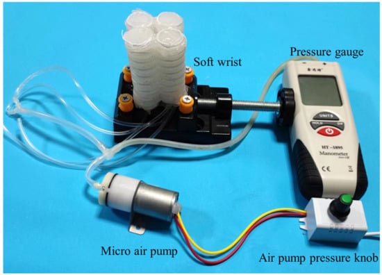 Soft robotic grippers can be used to grasp various objects and have been applied in many industrial practices [,,,,,]. To increase the dexterity of grippers, an active soft wrist is highly desired due to its ability to increase grasping ranges and perspectives [,]. Contemporarily, these movements of bending and twisting for the wrists of grippers are achieved by the forces and torques generated by a series of motors [,]. Although different motions are obtained, the multiple motors used in the wrist make it relatively heavy and they cause a high energy consumption. In addition, it is difficult to achieve specific bending or twisting angles via the adjustment of forces and torques by the motors [].