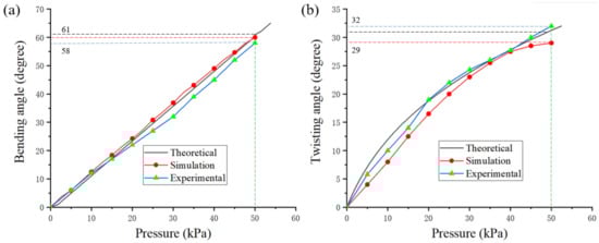 Figure 8 shows that overall, the bending and twisting angles of the soft wrist increased similarly with the increase of pressure for analytical, simulation, and experimental tests. The deviations between the three results are mainly ascribed to the simplified hyper-elastic model for the silicon chamber and the homogeneous assumptions for the restriction layers in the theoretical and simulation analysis []. To further illustrate that the deviations are small, the angles for bending and twisting for 50 kPa are denoted for the analytical, simulation, and experimental results. Both deviations of the bending and twisting angles are within 2.5%, which verifies that the simulation approach can be used to predict angles of bending and twisting for the soft wrist under pressure of 50 kPa.