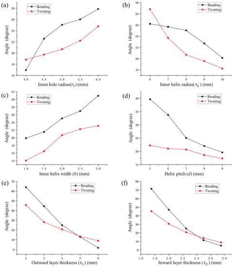 The influences of the geometric parameters on the angles of bending and twisting for air pressure of 50 kPa are presented in Figure 9. It can be seen from Figure 9a that both the bending and twisting angles are increased by increasing the inner hole radius . This is because an increase in the inner radius reduces the thickness of the chamber, which leads to higher elasticity so that the deformation is larger []. Figure 9b demonstrates that larger helix radii result in smaller angles of bending and twisting. This is due to the fact that when the outward radius increases, the cross-sectional moment of inertia increases, leading to increased stiffness [], thus resulting in a smaller actuator deformation. Figure 9c presents that increasing the width of the inner helix surface enhances the motions of the soft wrist. The reason for this is that when the width of the inner helix surface increases, the force area inside the drive chamber increases, which also leads to greater deformation []. Figure 9d shows that the increase in pitch results in smaller bending and torsion angles. The reason can be ascribed to the fact that the increase in pitch leads to a reduction in the number of spiral turns of the actuator, which makes it less stretchable. Additionally, in the case of a constant drive length, since the number of spiral turns is inversely proportional to the pitch, the deformation capability of the actuator varies more when the pitch is small. Figure 9e,f illustrate that the increase of the inward thickness and the outward thickness of the chamber lead to an increase in the material of the actuator, resulting in an increase in its stiffness [].