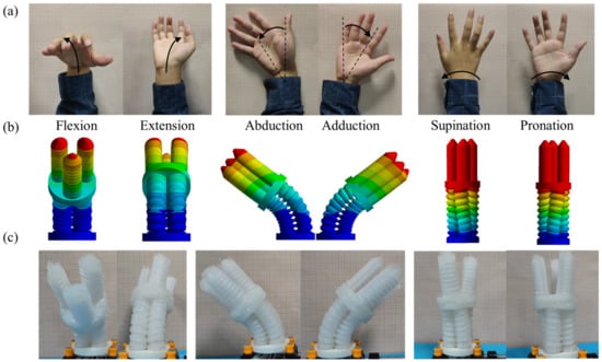 Motion of soft wrist for soft robotic hand: (a) real human hand; (b) simulation; (c) experiments.