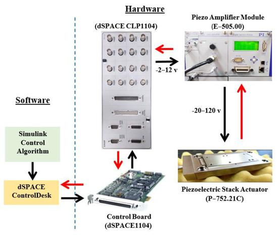 Hardware Components: A high-speed nanopositioner stage (P-752.21C) was used to provide precise motion in a single axis, manufactured by Physik Instrumente Company, Germany [33]. This stage contained a piezoelectric stack actuator made of a ceramic material (PICMA® P-885), which could precisely expand and contract, forcing flexures to move along the desired axis. This actuator could be excited by an applied voltage ranging from −20 to 120 V, within a travel range of up to 35 µm, and a displacement resolution of 0.1 nm. To measure the output displacement, the stage was equipped with a high-resolution capacitive position sensor (D-015), which had a bandwidth of up to 10 kHz and a resolution of 0.01 nm. This sensor gave analog outputs in the voltage range of 0–10 V. To drive the piezoelectric actuator, a voltage piezo amplifier module (E-505.00) [34], from Physik Instrumente Company, Germany, was used. This module had a fixed gain of 10, and a bandwidth of 3 kHz. The operating input voltage range of this amplifier was −2 to +12 V and the output voltage response was in the range of −30 to +130 V. The input/output signals were sent from/to a control board (DS1104, dSPACE Inc, Wixom, MI, USA) [35] through a connector (dSPACE CLP1104) with 16 BNC ports. The dSPACE1104 board was used to implement control algorithms. It is well-suited for rapid prototyping and complex control systems [36,37,38], as it has a high-speed processor (250 MHz), 32 MB SDRAM, and 8 MB flash memory. The dSPACE1104 was directly connected to a host computer containing software packages that were used to build control models, generate C code, and visualize data.