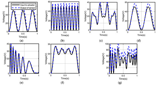 The corresponding input–output relationship obtained by: (a) reference input A; (b) reference input B; (c) reference input C; (d) reference input D; (e) reference input E; (f) reference input F; and (g) reference input G.