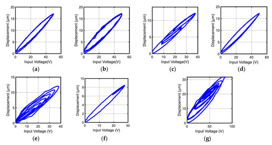 The lag in the output response of the actuator generated by: (a) input voltage A; (b) input B; (c) input voltage C; (d) input voltage D; (e) input voltage E; (f) input voltage F; and (g) input voltage G.