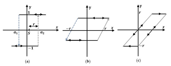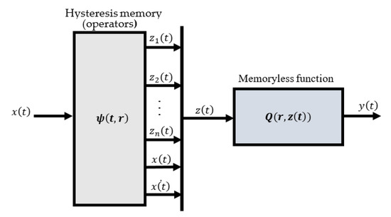 The proposed hysteresis model was inspired by the Preisach model [39,40]. The hysteresis behavior was described in the Preisach model using a hysteresis memory constructed by relay operators. Then, it utilized a memoryless mapping function for model identification, as demonstrated in Figure 4. The relay operator is typically defined by two thresholds, and , where ≤ , as shown in Figure 5a. At these thresholds, the relay operator’s output was either +1 or −1. Assuming that a voltage z(t) drives the piezoelectric actuator, the output can then be predicted by the Preisach model, as follows: