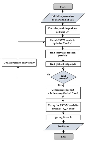 where is the velocity of particle and is the position of particle. The η is called the inertia weight, which is used to adjust the balance between global search and local search, indicates the current global best, indicates the current personal best, is the learning factor for personal movement, is the learning factor for group movement, and and are random numbers that are uniformly selected in the range [0, 1] at each iteration. In this study, cross-validation was used to evaluate fitness on the training dataset. The flowchart of the PSO-LSSVM algorithm is presented in Figure 6.