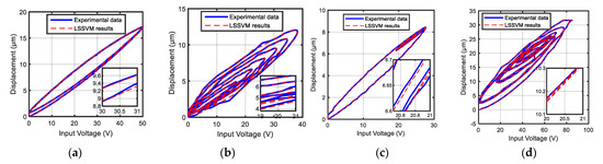 Consequently, artificial neural networks (ANNs) have been used to obtain an applicable inverse model. Although ANN-based models have addressed the computational complexity issues and introduced an appropriate nonlinear input-output mapping [13,14,15], they often suffer from overfitting, as they are prone to falling into local optimums, which affects their generalization ability [16]. To avoid this effect, the least-squares support vector machine (LSSVM) [17] has been used. In general, LSSVM is superior to and more accurate than ANNs, as it can reduce the upper bound of the generalization error, whereas ANNs can only minimize the training error [18]. As LSSVM only deals with one-to-one mapping, whereas hysteresis is defined as multi-valued, few studies have attempted to provide a suitable hysteresis map, often based on expanding input space into multidimensional space. For instance, the authors in [19,20,21,22] used nonlinear autoregressive exogenous (NARX) models in which the input was expanded to include current and past inputs, as well as the past outputs. Although the results showed that the outputs could be well-predicted, the output of the inverse LSSVM-NARX model that is fed to its input usually results in accumulated errors over time [23,24].