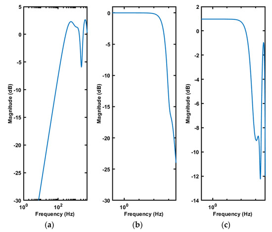 Closed loop sensitivity functions of the proposed RST control design: (a) output sensitivity function; (b) complementary sensitivity function; and (c) input sensitivity function.