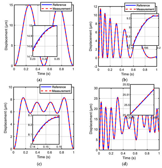 Experimental results of reference tracking in a closed loop with RST control and LSSVM compensation corresponding to: (a) test reference H; (b) test reference I; (c) test reference J; and (d) test reference K.