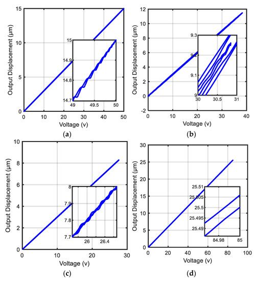 The effect of the proposed control scheme on hysteresis loops of the considered piezoelectric actuator. The loops shown were obtained by: (a) test reference D; (b) test reference E; (c) test reference F; and (d) test reference G.