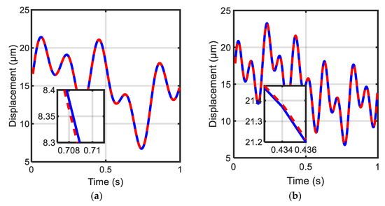 A hybrid controller was designed, composed of feedforward and feedback algorithms. The inverse PSO-LSSVM controller was used to compensate for hysteresis nonlinearity, whereas the RST was used to eliminate system disturbances and achieve precise tracking. To design the RST controller, a linear dynamics model G(z) corresponding to the piezoelectric actuator was required. Thus, the actuator was excited by a chirp voltage signal with a small amplitude to neglect the hysteresis effect on the output response. The input and output of the piezoelectric stage were used for open-loop identification to characterize the plant model. The parameter estimation was carried out using the recursive least squares (RLS) algorithm. The simulation results showed that a fourth-order model was suitable to characterize the linear dynamics of the considered actuator, as shown in Figure 12. It should be noted that the predicted output closely fit the actual output and the error of the fourth-order model was small, which could be handled by the robustness of the RST controller. The plant mode G(z) was identified and its numerator and denominator polynomials were obtained, as follows: