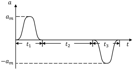 The traditional trapezoidal velocity curve at the end of the manipulator is shown in Figure 2, and the acceleration curve of the trapezoidal velocity is shown in Figure 3. As shown in Figure 3, the acceleration curve of the trapezoidal velocity changes abruptly. It can be seen from Equation (19) that when the acceleration of the end of the manipulator changes abruptly, the angular acceleration of the joint also changes abruptly.