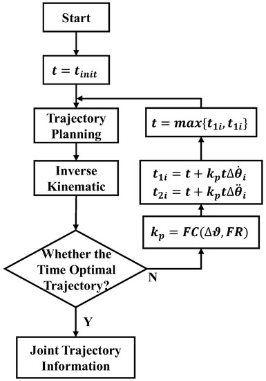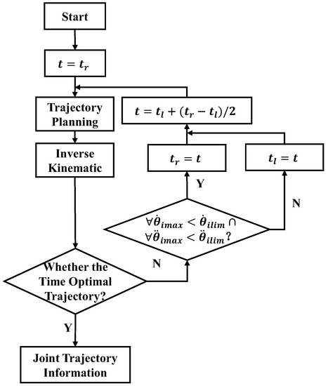 In the process of trajectory planning, if only the constraint condition of the angular acceleration of joint i is considered, then a time t can be found such that when the manipulator is running along the trajectory, the maximum angular acceleration of joint i reaches the angular acceleration constraint condition of joint i; t at this time is the shortest time that only considers the constraint condition of the angular acceleration of joint i. A block diagram of TOTP is shown in Figure 6. The joint parameters () after each trajectory planning and inverse kinematic were compared with the joint constraints, and a time search was performed.