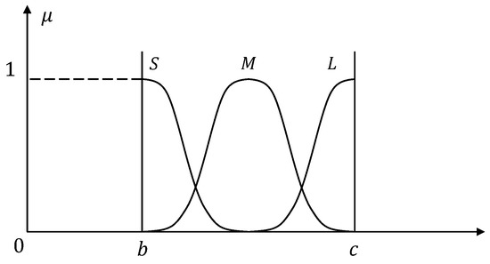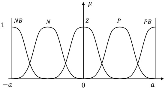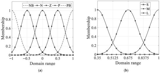 The membership function of each fuzzy set of input linguistic variables is shown in Equation (58), where x∈[−1, 1], σ = 0.2142. The membership function of each fuzzy set of output linguistic variables is shown in Equation (59), where y∈[0.35, 1], σ = 0.1. The membership function corresponding to the input linguistic variables and output linguistic variables are shown in Figure 13. For input linguistic variable, x∈[−1, 1], which is due to the normalization of Equations (56) and (57). In order to ensure the completeness of the membership function [30], the membership degree at the intersection of the two membership functions is 0.5, combined with the experience summarized in the simulation debugging process of this study, the σ can be set to be 0.2142. For output language variable, it has three fuzzy sets. In order to make the membership of S and L at 0.675 tend to 0, so that the output has better clarity, the σ can be set to be 0.1.