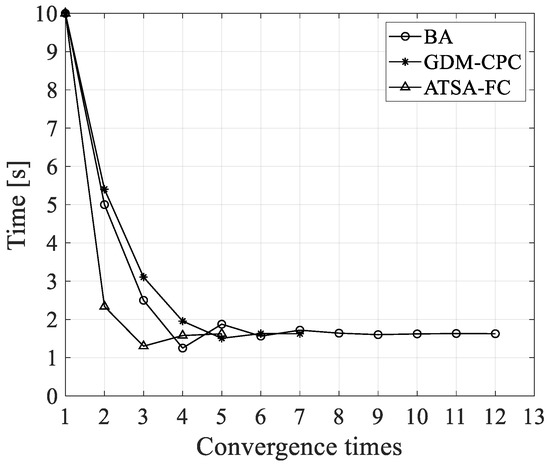 The convergence curves of the controlled time of the three algorithms using BA, GDM-CPC with , and ATSA-FC are shown in Figure 15.