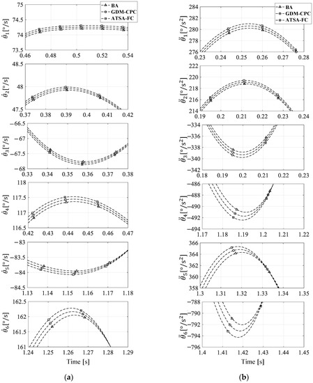 When using BA, GDM-CPC and ATSA-FC, the , , and of each joint at trajectory shortest time are shown in Table 6, Table 7 and Table 8, respectively.