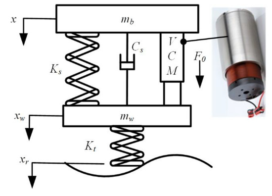 where x is the vertical displacement of the body relative to its static equilibrium position, xw is the vertical displacement of the wheel relative to its static equilibrium position, xr is the vertical displacement of the road relative to its initial position; Ks, Kt is the suspension spring stiffness and the wheel equivalent stiffness, respectively. Cs is the suspension damping coefficient. mb and mw represent the mass of the vehicle and the quality of the wheel, respectively. The active control force F0 is generated by the voice coil motor.