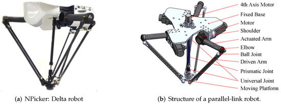 The parallel-link manipulator shown in Figure 1 is a three-degree-of-freedom robot that usually comprises three closed-loop kinematic chains, a fixed base, and a moving platform. Owing to the small mass of the manipulator and three actuators on the fixed base, this parallel-link robot can achieve high precision and high movement speed for pick-and-place tasks. Figure 2b shows the kinematic chain of this robot.