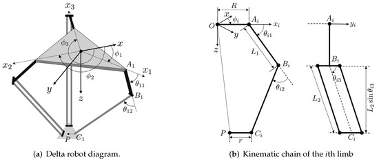 In this section, the derivation of the inverse kinematics of a delta robot is presented. Consider Equation (A2). From the second row of (A2), angle is calculated as