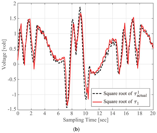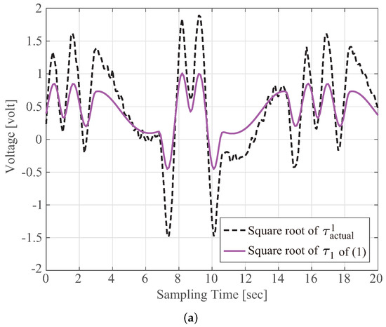 Command signals () that are numerically calculated using (1) by the aforementioned procedure should perfectly match the corresponding actual torque for guaranteeing that the centroid P of the moving platform perfectly tracks the three-dimensional trajectory . In other words, an imprecise value can never provide high tracking performance for the predesigned trajectory of P. Therefore, a thorough similarity evaluation between and is an essential prerequisite for the practical application of delta robots. In this respect, the accuracy of obtained using (1) with the parameter values provided by the manufacturer, as listed in Table 1, is evaluated as follows. The actual torque that is delivered by the implemented motor to the actuated arm cannot be directly determined. Thus, the well-known fact that the torque is proportional to the square of the operating voltage (i.e., ) was introduced in the following experiments. First, the user-selected () was supplied to each motor to activate the parallel-link robot. The dashed line in Figure 3a indicates such a value that is approximately equal to the square root of . Second, the active joint angle was directly measured by sensors during robot operation. Angular velocity and acceleration were calculated from the joint angle data by using central finite difference methods. Lastly, the computed command signal in (1) was obtained by using the parameter values listed in Table 1 and the , , and values. The solid line in Figure 3a denotes the computed voltage that is equivalent to the square root of the computed torque . The discrepancy between and in Figure 3a implies that the amount of torque exerted by the motor with a computed voltage input cannot achieve the high-precision tracking of the predetermined reference trajectory . By contrast, the reference-tracking errors may become small upon the implementation of a suitably designed controller. For example, inverse dynamic control or computed torque control is one of the most effective, well-accepted, and widely used control schemes for rigid robotic manipulator systems to drive the manipulator along the given trajectory as precisely as possible [12]. The key idea of such a control scheme is to introduce feedback linearization to cancel the nonlinear robot dynamics under the assumption that all parameters of the system model are exactly known. Therefore, the inexactness of the model parameters, which can be verified from the discrepancy between and in Figure 3a, results in the degradation of robot performance, even when a model-based motion controller is implemented. Accordingly, the development and identification of a dynamic analytic model of the delta robot are indispensable for calculating actuator torques with high precision. In addition, such an exact dynamic model can contribute to reducing the control effort of model-based controllers required for the trajectory-tracking behavior of robot manipulators.