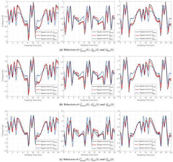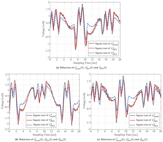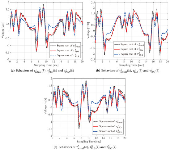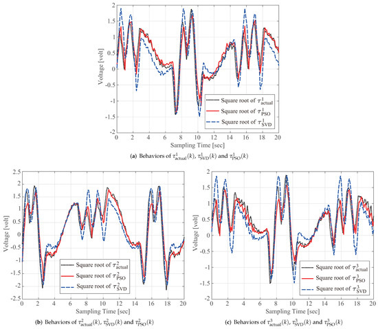 where the notation “*” denotes PSO, RLS, DLS, or SVD, and and are the maximal and minimal elements of the sampled data from the computed torque . A value for (41) close to 1 indicates less variance between the actual torque and model-based computed torque; thus, Table 2 verifies that the proposed scheme outperforms the conventional identification method.