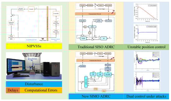 To simplify for the sake of understanding the problem of concern in this paper, Figure 1 summarizes the problem and the proposed mechanism. Regarding the problem of secure control of NIPVSSs with disturbance caused by delays and computational errors, the traditional SISO ADRC can achieve stable control of pendulum angle, but cannot achieve stable control of cart position. The proposed SIMO can achieve dual stable control of pendulum angle and cart position even under image attacks.