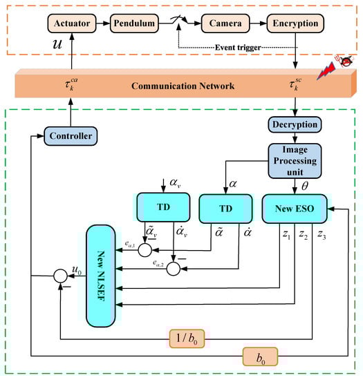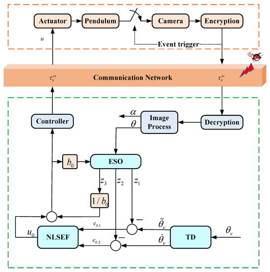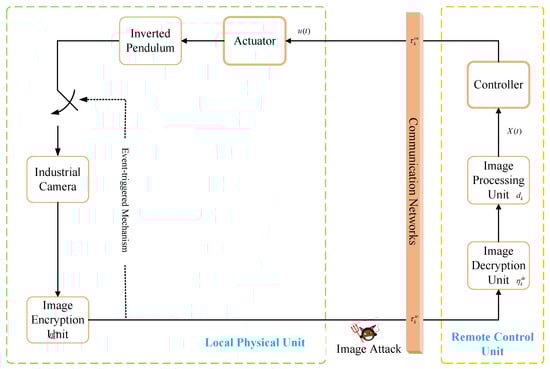 The NIPVSSs framework is shown in Figure 2, and the model is shown in Figure 3. Firstly, the industrial camera captures the inverted pendulum image in real-time motion. The image is then encrypted via an image encryption unit and the next image is captured by an industrial camera through an event-triggered mechanism. Secondly, the encrypted image is sent to a remote control unit through the network, and the image encryption unit encrypts the image. Furthermore, the image-processing unit calculates the state of the inverted pendulum and then sends it to the controller that calculates the corresponding control input according to the state. Finally, the calculated control input is transmitted to an actuator through the network, and the actuator gives the corresponding drive pulse to the inverted pendulum according to the control input, thus allowing the inverted pendulum to run smoothly at the balance point.