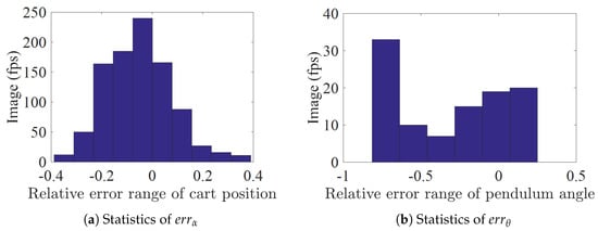 The values of and when and can be obtained according to statistical analysis. For example, in the NIPVSSs experiment, 2000 image frames are collected and the relative errors and between cart position in addition to pendulum angle from the encoder and those from the image extraction are obtained in Figure 4. Considering and , it can be observed from Figure 4 that and when and .