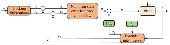 ADRC [27] mainly includes: Tracking Differentiator (TD), Extened State Observer (ESO), Nonlinear State Error Feedback (NLSEF) and disturbance compensation. A typical second-order ADRC structure is shown in Figure 5.