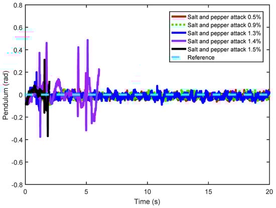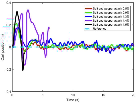 The salt and pepper attack intensity is decided by the attacker whose aim is to destabilize the system. Figure 12 and Figure 13, and Table 3, show that (1) the intensities of 0.1%, 0.9% or 1.3% are slight and the system remains stable, and (2) the intensities of 1.4% or 1.5% are unmanageable and lead to system destabilization.