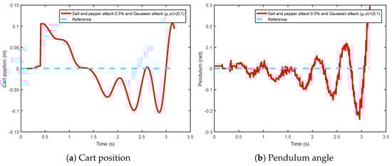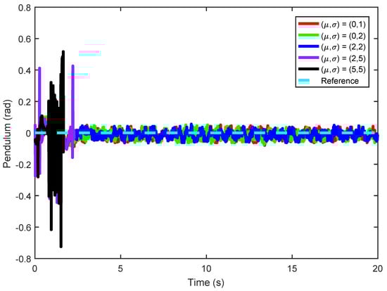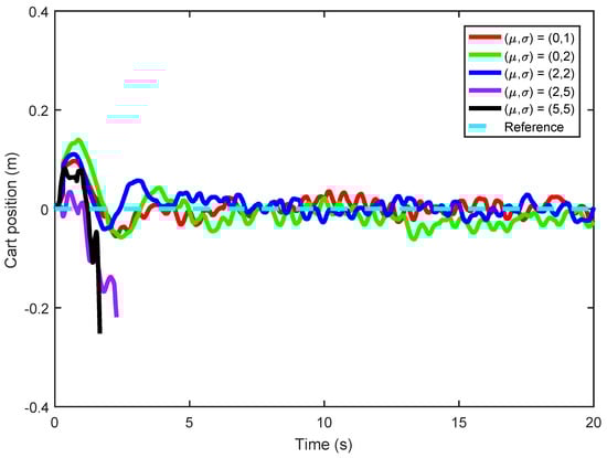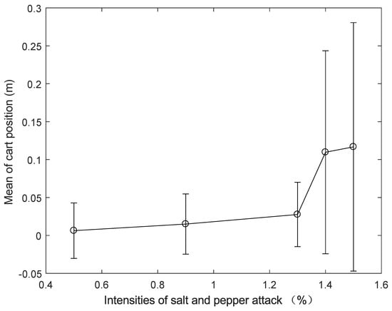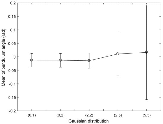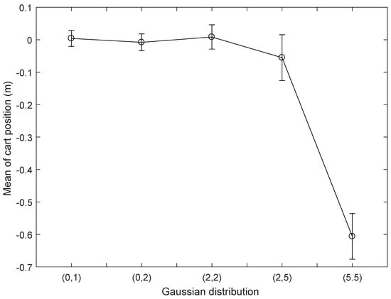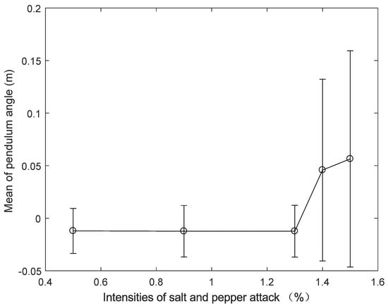 Gaussian attacks with different distributions , , , and are injected into the inverted pendulum image, and the ADRC method is used to conduct the inverted pendulum real-time control experiment in turn. The cart position and pendulum angle of the real-time control experiment are shown in Figure 20 and Figure 21, demonstrating that when the Gaussian attack obeys , , , or , there is no significant difference between the cart position and pendulum angle; however, when the Gaussian attack obeys or , the cart position stops with violent movement of the pendulum angle. Meanwhile, the mean and standard deviation of cart position and pendulum angle are shown in Table 5. It can be seen from Table 5 that: when or increases, both the mean and standard deviation of cart position increase, while the mean of the pendulum angle does not increase; however, the standard deviation increases rapidly, which indicates that with an increase in or of Gaussian attack, the pendulum angle becomes increasingly divergent, leading to system instability. To more intuitively display the influence of Gaussian attacks subject to different distributions on the cart position and pendulum angle, the mean and standard deviation of cart position and pendulum angle are shown in Figure 22 and Figure 23. Figure 20, Figure 21, Figure 22 and Figure 23 show that when the system is subjected to a Gaussian attack with a certain Gaussian distribution, the control law designed by ADRC can achieve stable control of NIPVSSs with an increase in the Gaussian attack, and its stability can be slightly affected; however, there is no conspicuous fluctuation. When or of the Gaussian attack increases, the designed controller cannot achieve stable control of NIPVSSs, resulting in the divergence of NIPVSSs. The real-time control experiment shows that the system can operate stably with ADRC method under the Gaussian attack obeying and .
