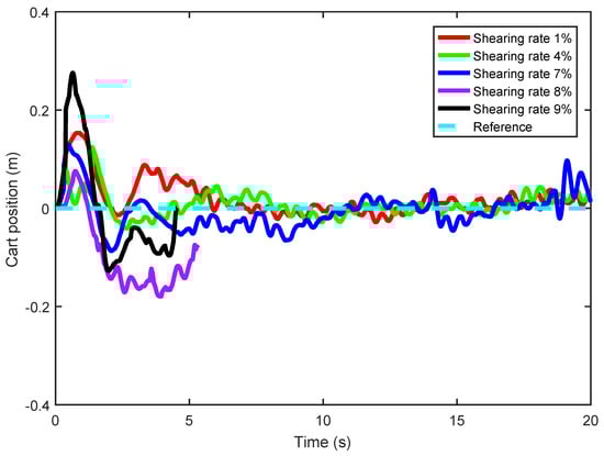 Shearing attacks at different shearing rates (1%, 4%, 7%, 8%, 9%) are injected into the inverted pendulum image, and the ADRC method is used to conduct real-time control experiments of the inverted pendulum in turn. The cart position and pendulum angle of the real-time control experiment are shown in Figure 16 and Figure 17, where one can observe there is no significant difference between the cart position and pendulum angle when the shearing rate is 1%, 4% or 7%. However, when the shearing rate is 8% or 9%, the cart position stops with violent movement of the pendulum angle. Meanwhile, the mean value and standard deviation of cart position and pendulum angle are shown in Table 4. It can be seen from Table 4 that: When the shearing rate is less than or equal to 7%, both cart position and pendulum angle are in stable operation. However, with the increase of shearing rate, the mean value of cart position is gradually away from the balance point 0 m, and the mean value of pendulum angle is gradually away from the balance point 0 rad, and the standard deviation of cart position and pendulum angle is gradually increased, but there is no sharp increase; When the shearing rate starts from 8%, the mean and standard deviation of cart position and pendulum angle increase sharply. To more intuitively display the impact of different shearing attacks on the cart position and pendulum angle, the mean and standard deviation of cart position and pendulum angle are shown in Figure 18 and Figure 19. Figure 16, Figure 17, Figure 18 and Figure 19 show that after the system is subjected to a shearing attack at a certain shearing rate, with the shear rate gradually increasing, the control law designed by ADRC can achieve the stability control of NIPVSSs, and its stability can be slightly worse, but there is no obvious fluctuation; When the shearing rate is greater than 7%, the designed control law cannot achieve the stable control of NIPVSSs, resulting in the divergence of NIPVSSs. The real-time control experiment shows that NVIPCS can tolerate 7% of the maximum shearing rate after using ADRC method.