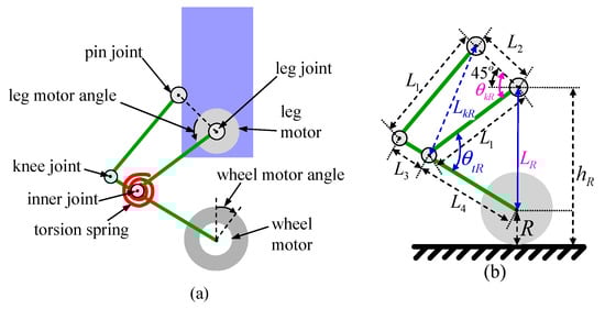 Figure 1 shows the mechanical structure of the WBR: Figure 1a shows the leg components and Figure 1b shows the kinematic models. The developed WBR, which consists of a body and two legs with wheels, is a promising way to improve the performance of bipedal robots in terms of flexibility, movement speed, and energy efficiency. By adding wheels to the ends of the legs, each leg can be independently extended and retracted by driving a leg motor mounted on the hip of the body. The torsion springs installed in the inner joints (see Figure 1a) are used to counteract the weight of the WBR itself, which can reduce the control effort of the leg motors when driving or standing to improve the overall efficiency of the robot. The total height of the WBR can be adjusted between 26 cm and 33 cm through the realization of a four-bar linkage.